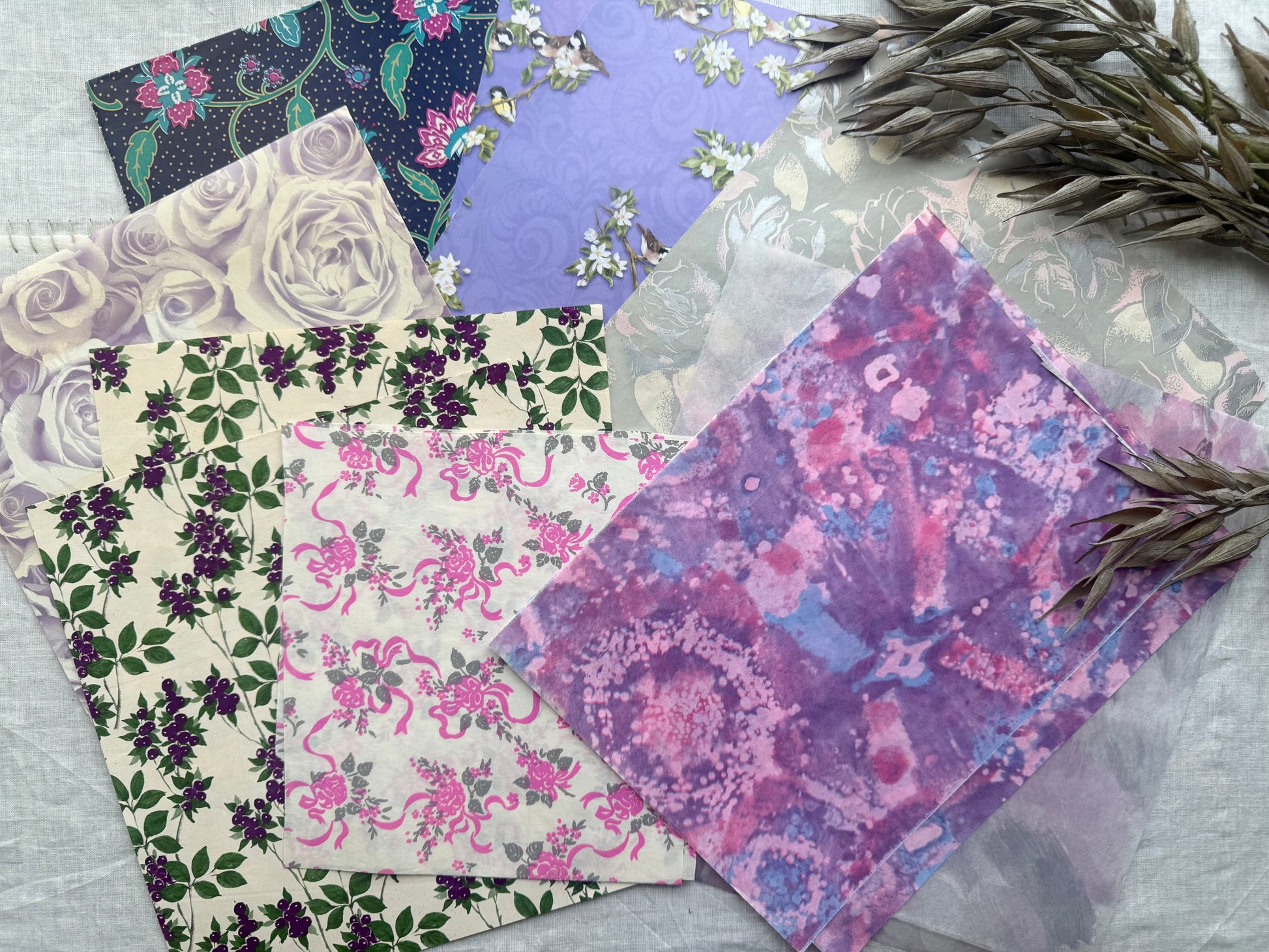 Includes 12 randomly selected patterns like the papers shown in the photograph all in shades of purple.