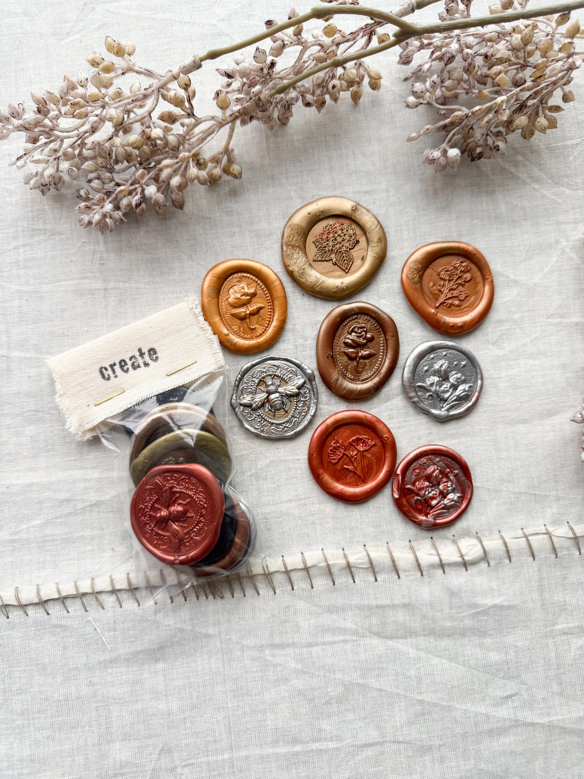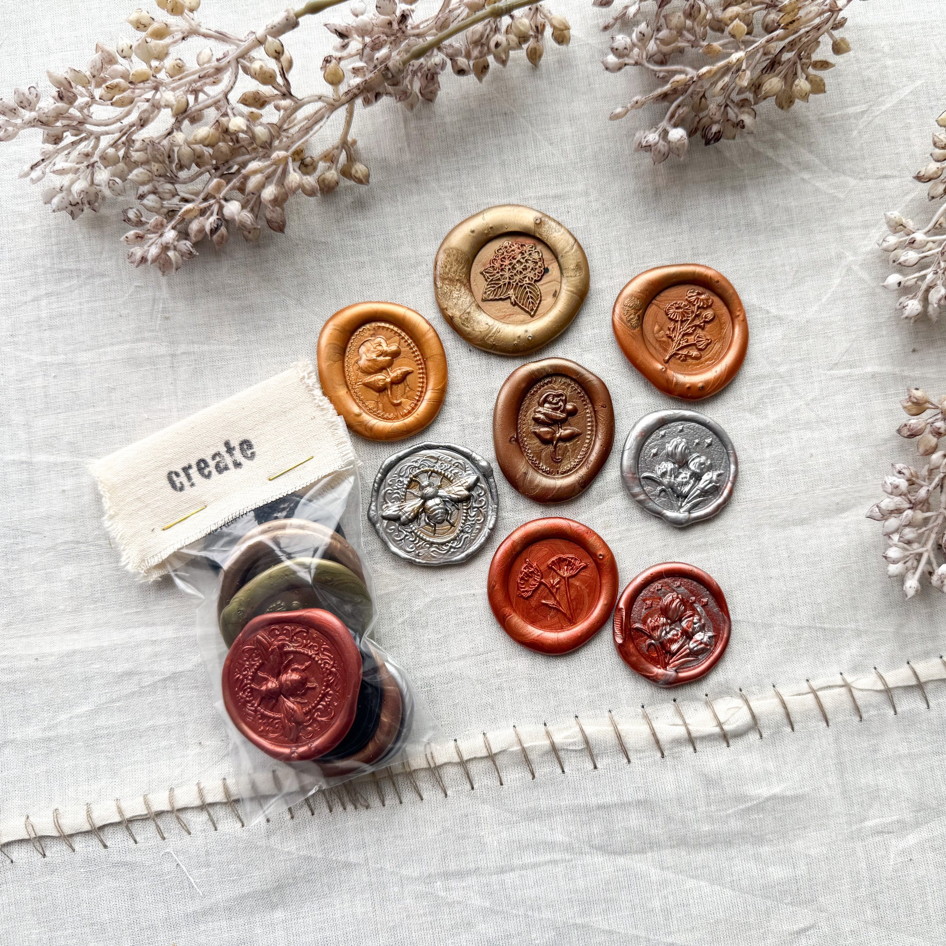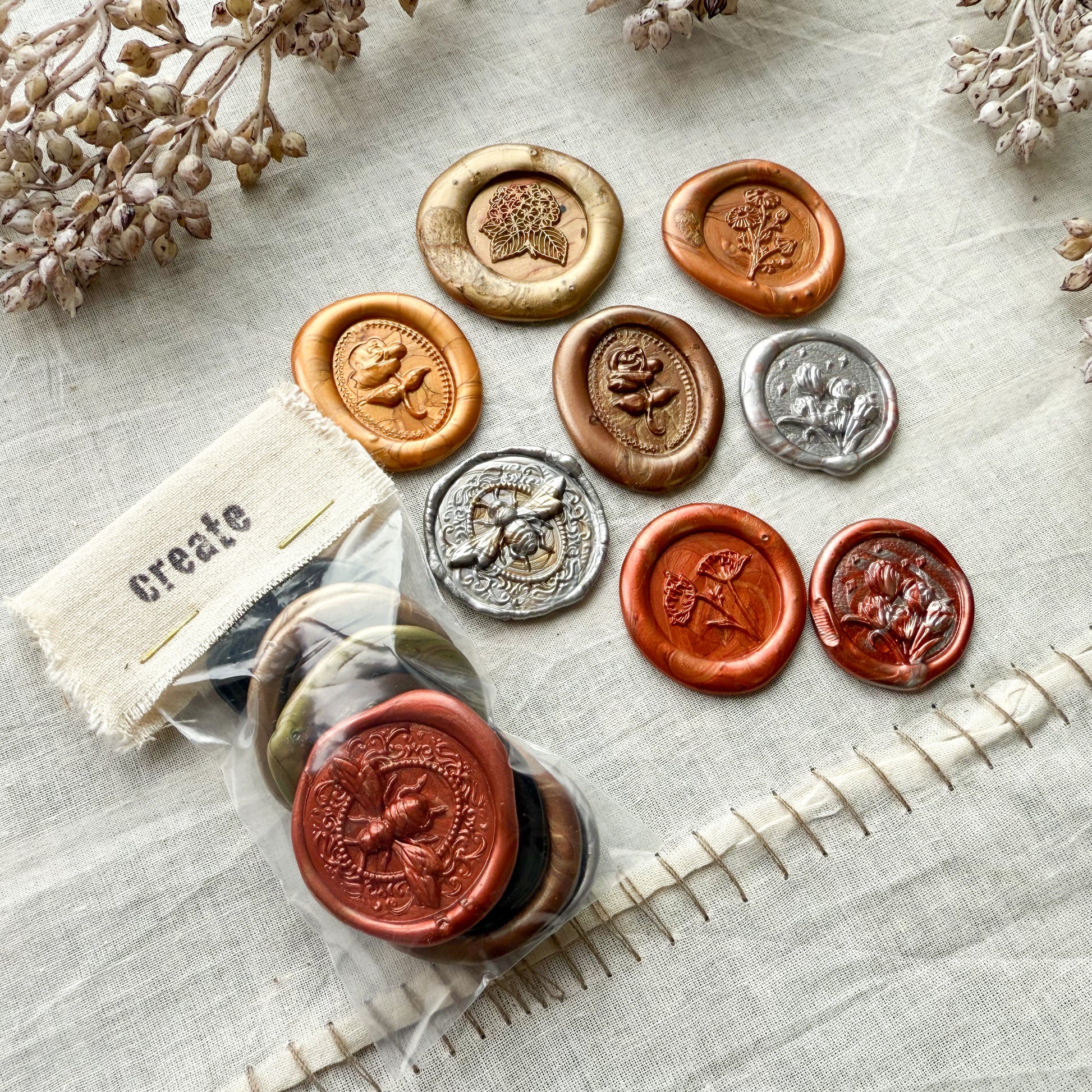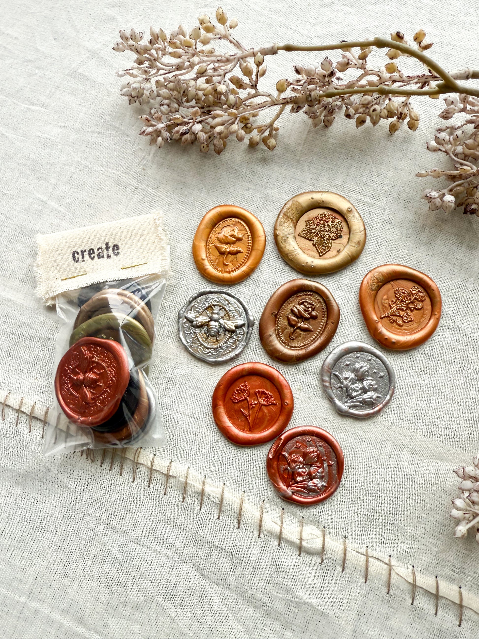 These wax seals to be used for crafts, wall art, scrapbooking and much more. The perfect ephemera for journaling, collages, home decor crafts, and DIY projects.