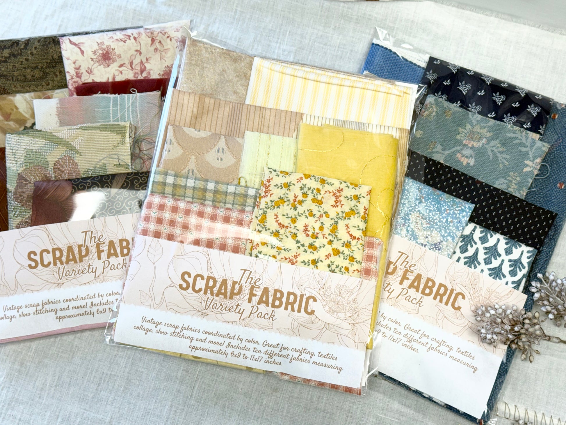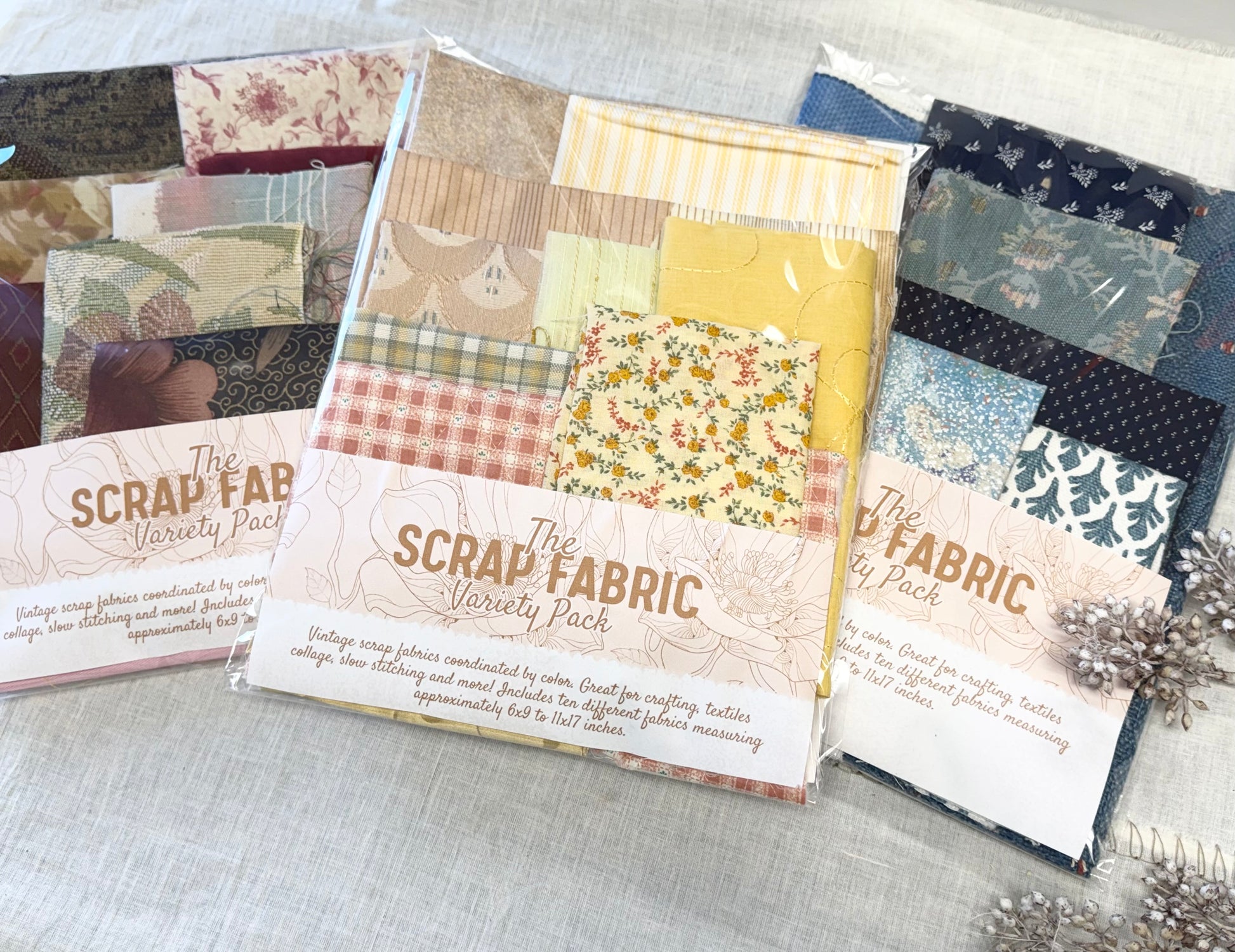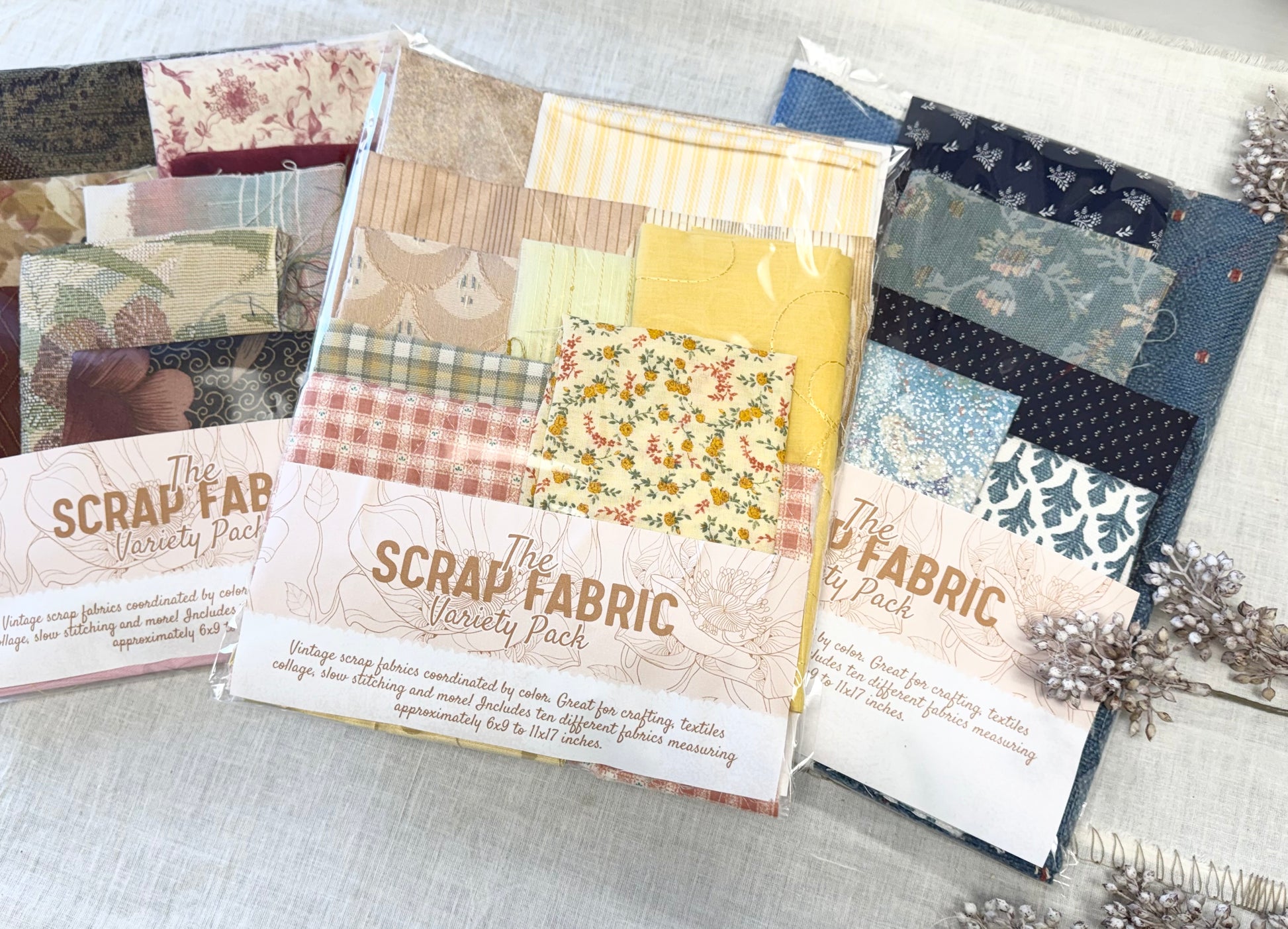 Enjoy a variety of fabrics in these coordinated packs by color. Includes all fabric types and patterns. This pack includes 10 different fabrics measuring (approximately) between 6x9 to 11x17 inches. Great for fiber arts, textile collage and slow stitching.